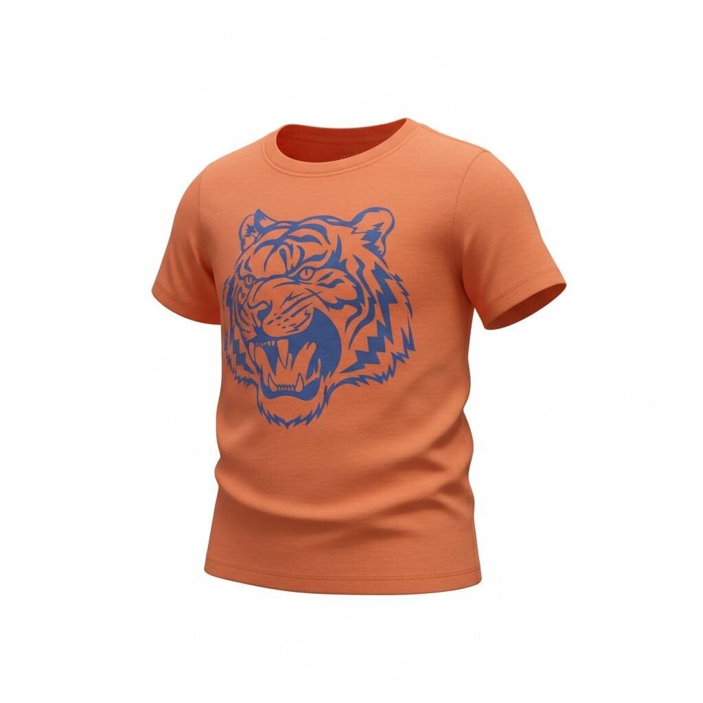 Short sleeve orange graphic tee showcasing a blue tiger.