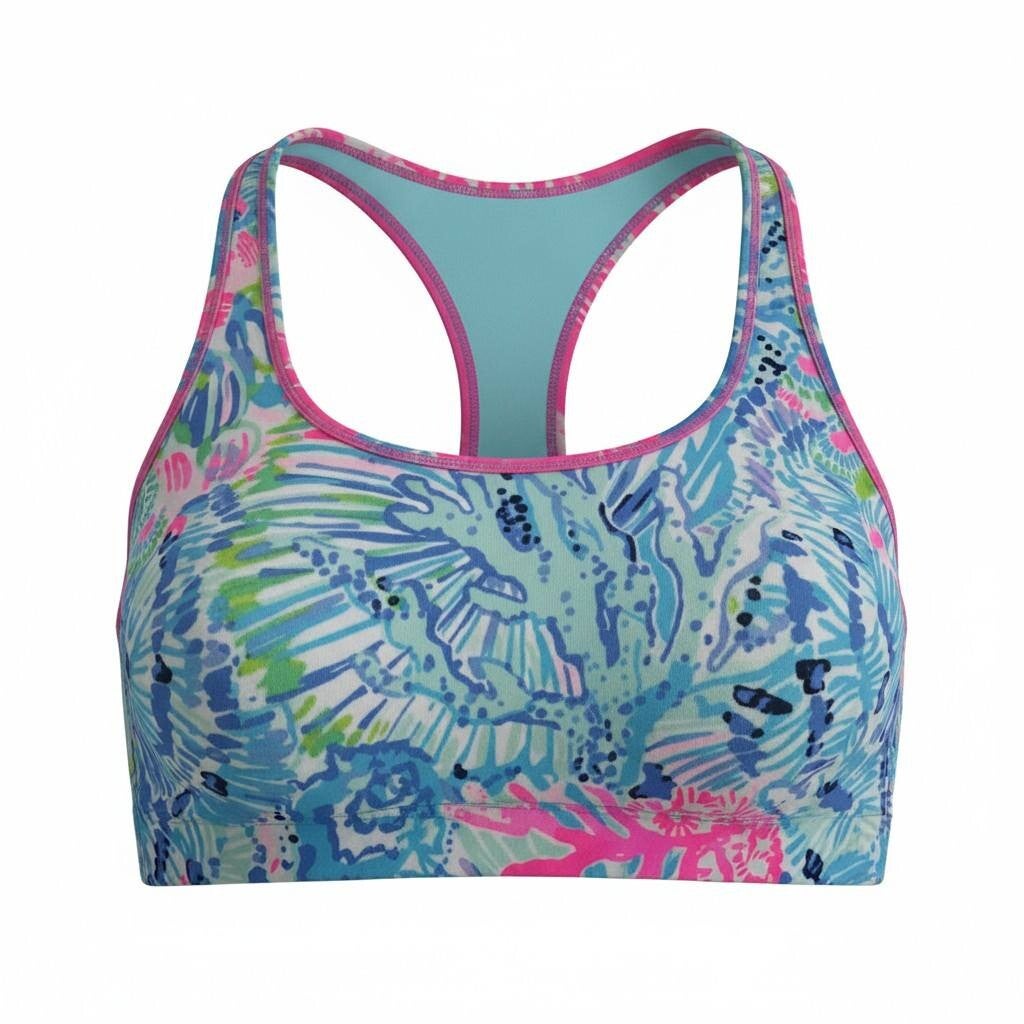 This Lilly Pulitzer Luxletic Teegan racerback sports bra in Size XS features a vibrant floral and coral-themed prinThis item is the Lilly Pulitzer Luxletic Teegan Sports Bra, featuring the vibrant "Sink or Swim" coral and sea-inspired print. Made from lightweight power stretch fabric designed for comfort and mobility during athletic activities. It typically includes UPF 50+ sun protection and moisture-wicking properties, making it suitable for both land and water activities